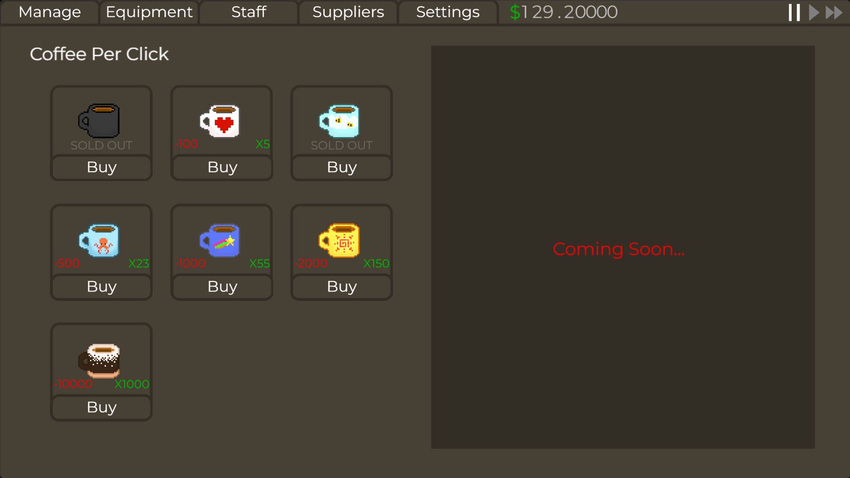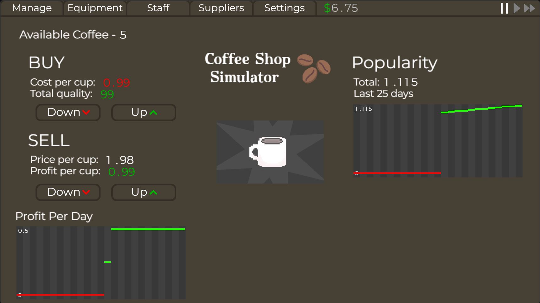 Welcome to โCoffee Shop Simulatorโ! Run your own coffee empire, choose your own prices, control the coffee quality and watch your bank account go to the moon ๐.